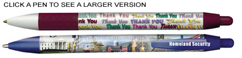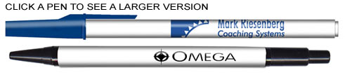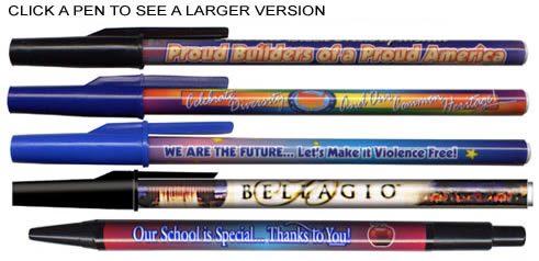 With our custom 4-color decorated pens, you can put forth your promotional messages and let your imagination run wild. These brilliantly printed pens provide for graphics that are clear, sharp and permanently printed via a special heat transfer process. Best of all, the entire area of the pen is used for the imprinting thereby providing maximum visual effectiveness. Tie your print advertisements, product packaging, web design, annual report or any other theme to this attractive promotional media. Choose our popular stick pen or our retractable click pen at a slightly higher price.